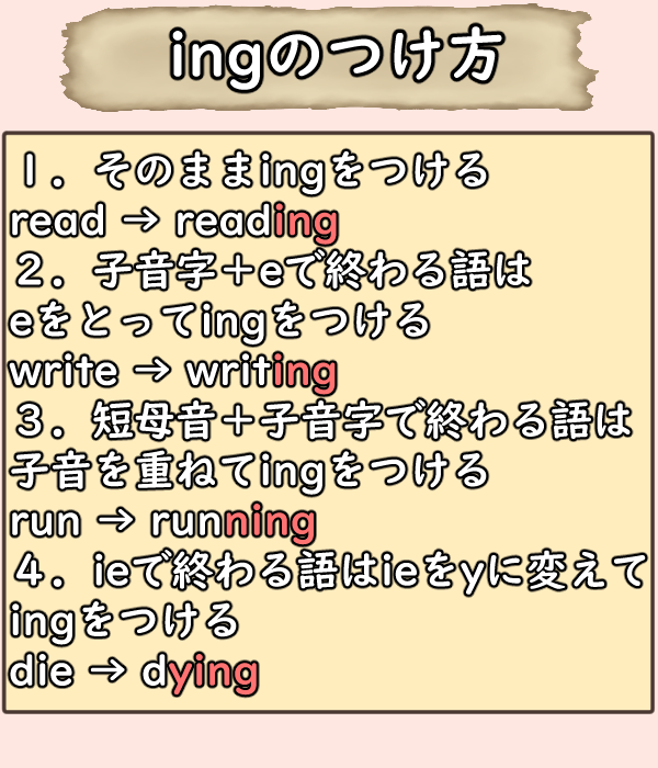 ing形か、どうせ単語によってただ”ing”をつけるだけじゃないんだろ?”ing”のつけ方を教えてくれ