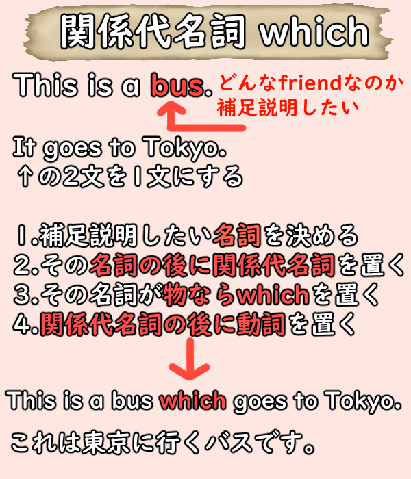 This is a bus. It goes to Tokyo.この文を1文にするゴン