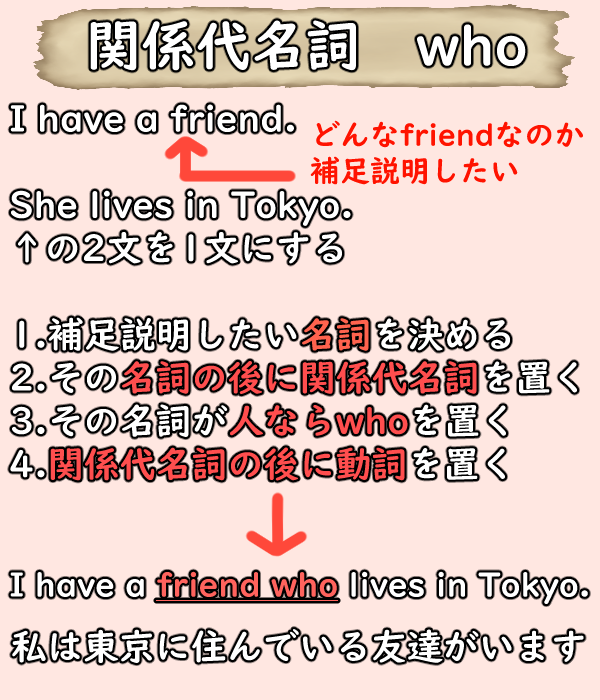 2つの文を1文にして「私は東京に住んでいる友達がいます」と言うには、関係代名詞というものを使うゴン!